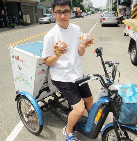 3年前選擇自己創業,創業初期,我都是背著裝滿麵包的爵士鼓,邊走邊賣,但是生意並不是那麼好,卻多少有新聞記者會來採訪,這讓我有了鬥志,持續改良、持續騎三輪腳踏車、四輪腳踏車…